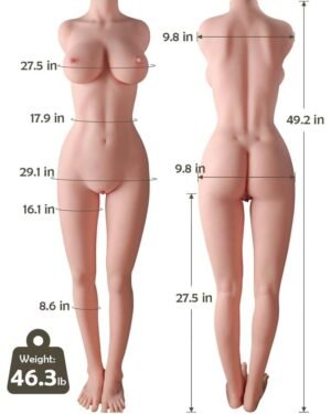 The dimensions of this sex doll are 49.2 inches in height, 9.8 inches in width, 27.5 inches in bust, 17.9 inches in waist, 16.1 inches in hips, 27.5 inches in leg length, and 46.3 pounds in weight. Every detail of her has been carefully designed to perfectly imitate the image of a young, fit, and sexy woman. Made of high-quality TPE material, it feels soft and smooth, like real skin.