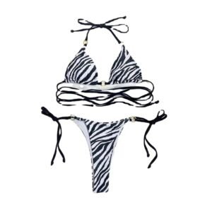 2024 Sexy Metal Button Bikini Swimsuit Bikini is a perfect blend of fashion and functionality, designed for confident modern women. This bikini features retro polka dots, stripes and a variety of animal patterns (such as zebra, snakeskin, leopard, etc.), combined with metal button decorations, showing a unique European and American style. Made of high-quality polyester fiber (polyester) and cotton blended lining, it is highly elastic, quick-drying and durable. The steel-free design is equipped with a soft chest pad to provide natural support and more comfortable to wear. A variety of colors and patterns are available for various fitness, body shaping, dance and swimming sports. A variety of sizes (S, M, L, XL) are available to suit women of different body shapes.